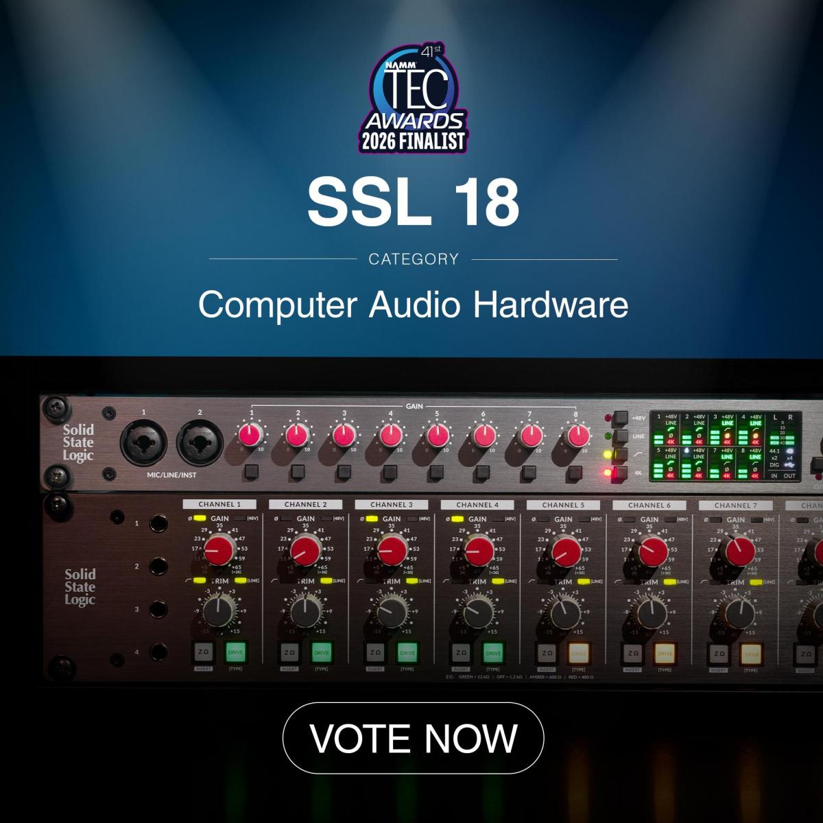 Das SSL 18, Finalist des TEC Awards in der Kategorie „Computer-Audio-Hardware“, läutet eine neue Ära der Rack-Produktionsttechnologie von SSL ein. Basierend auf dem unübertroffenen Know-how des Unternehmens im Bereich des analogen und digitalen Designs bietet das SSL 18 eine außergewöhnliche Audioleistung mit einem für Studio-Sessions optimierten Funktionsumfang, gepaart mit dem charakteristischen SSL-Sound und der erstklassigen Qualität, auf die Profis vertrauen. Ob beim Aufnehmen, Produzieren oder Abmischen – der SSL 18 optimiert Produktionsabläufe, steigert die Leistung und wird zum ultimativen Herzstück Ihres Studios.