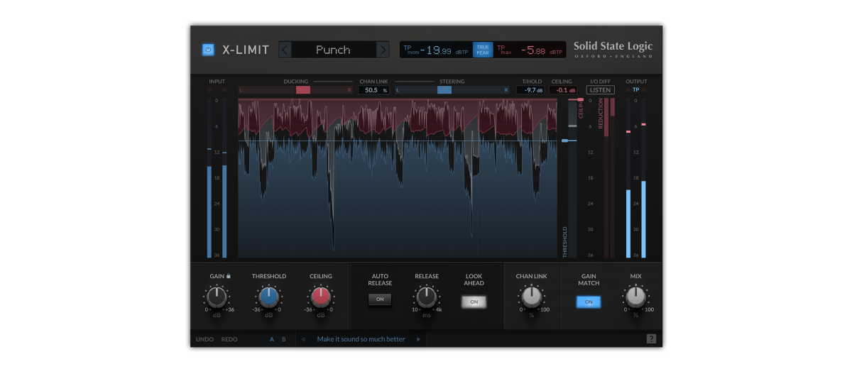 Wie andere SSL-Plug-ins zeichnet sich auch X-Limit durch prägnantes visuelles Feedback sowie einen umfangreichen Funktionsumfang und vielfältige Klangoptionen aus. Die einzigartigen Steering- und Ducking-Anzeigen zeigen an, wie sich der Limiting-Prozess auf das Stereobild Ihres Signals auswirken könnte, und geben visuelles Feedback dazu, wie Sie Stereoverluste bei Verwendung der Channel-Link-Steuerung minimieren können. Gleichzeitig ermöglicht Ihnen die integrierte Wellenform- und Schwellenwertanzeige, Schwellenwert und Obergrenze ganz einfach im Verhältnis zum eingehenden Signalpegel einzustellen.