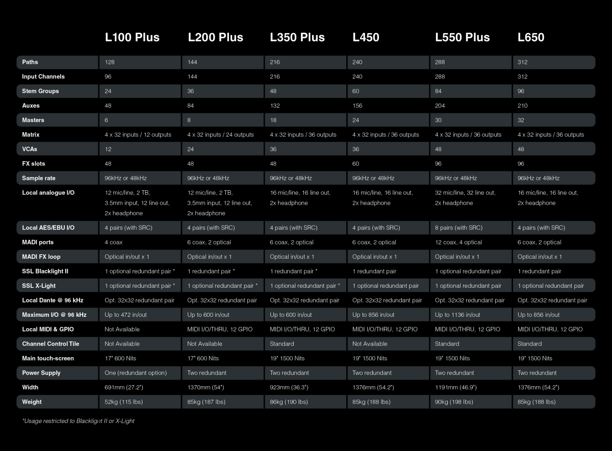 Die SSL Live-Konsolenreihe umfasst sechs Modelle: die L650, die L550 Plus, die L450, die L350 Plus, die L200 Plus und die L100 Plus. Wir bei SSL sind der Überzeugung, dass ein vielfältiges Angebot an Größen und Konsolenspezifikationen keine Abstriche bei der Qualität oder der Ausstattung bedeuten sollte.