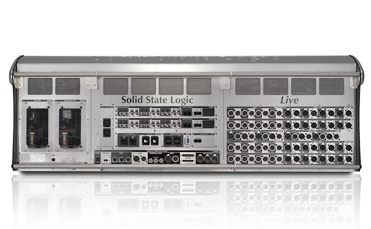 Standardkonfiguration der lokalen analogen Ein- und Ausgänge des L550 Plus: 32 Mikrofon-/Line-Eingänge, 32 Line-Ausgänge, 4 Kopfhörer-/Monitorausgänge. Konfiguration der digitalen AES/EBU-Ein- und Ausgänge: 8 Eingangs- und 8 Ausgangspaare. Die AES/EBU-Ein- und Ausgänge verfügen über eine stufenlos einstellbare Abtastratenkonvertierung. Standard-MADI-Port-Konfiguration: 6 redundante Koaxial-Paare und 2 redundante optische Paare. Wenn keine Redundanz erforderlich ist, können diese Verbindungen unabhängig voneinander genutzt werden, wodurch maximal sechzehn Ports zur Verfügung stehen. Zusätzlich gibt es einen separaten optischen MADI-Port (Ausgang/Eingang), der als „FX-Loop“ zum Anschluss eines externen Effektgeräts wie beispielsweise eines Systems mit Waves Multirack oder eines VST-Effekt-Hosts vorgesehen ist. Die Standardkonfiguration verfügt über keine SSL Blacklight II-Anschlüsse, es besteht jedoch die Möglichkeit, zwei redundante Paare hinzuzufügen. Eine optionale Dante-Karte ist ebenfalls erhältlich und bietet 32x32 Kanäle I/O bei 96 kHz (oder 64x64 Kanäle bei 48 kHz) über eine redundante Dante-Verbindung. Ein optionales redundantes Paar SSL X-Light-Anschlüsse bietet 256 bidirektionale Kanäle bei 96 kHz zwischen Konsole und Bühne über ein einziges Kabel mit robusten Steckern. Auf der Rückseite befinden sich außerdem Anschlüsse für MIDI, LTC, Wordclock und GP I/O. Die Konsole verfügt über redundante Netzteile.