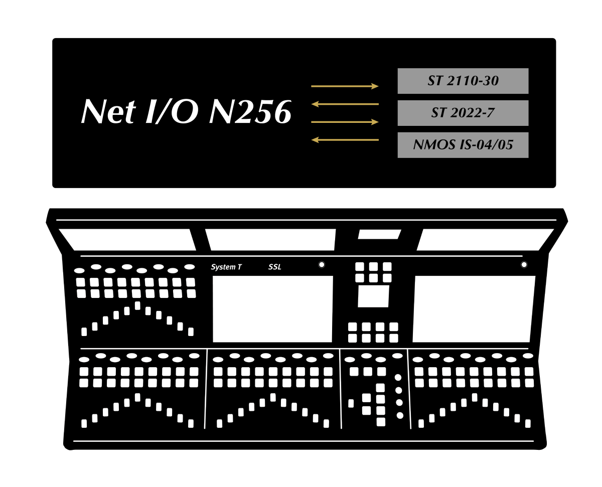 Net I/O N256 ist eine 256-Kanal-Schnittstelle zum Anschluss von System T an ST 2110-Netzwerke. Jedes N256-Gerät bietet bis zu 128 ST 2110-30-Sende- und 128 Empfangs-Streams, einschließlich vollständiger Unterstützung für ST 2110-30-Streams der Stufen A, B und C sowie für ST 2022-7-Stream-Redundanz. Für die Erkennung und das Verbindungsmanagement ist die NMOS-Funktionalität IS-04 und IS-05 integriert; alternativ kann die Anwendung SSL Connect (Zugriff über Webbrowser) für die zentrale Stream-Konfiguration, Routing-Steuerung und Kanalzuordnung genutzt werden. Die Netzwerktrennung stellt eine Firewall zwischen der Konsole und den ST 2110-Netzwerken dar und vereinfacht so die Integrationsanforderungen. Das N256 verfügt über redundante Netzwerkkonnektivität und zwei Netzteile.
