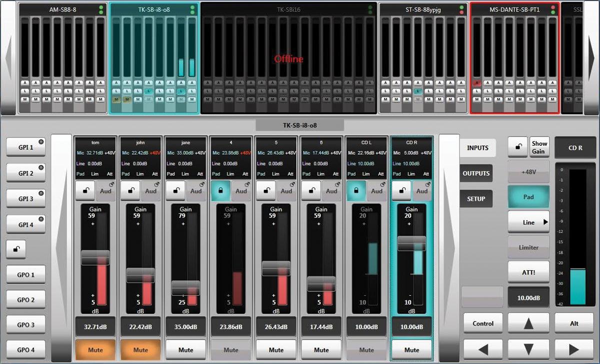 • Umfassende Steuerung der Dante-Netzwerk-Ein- und Ausgänge.