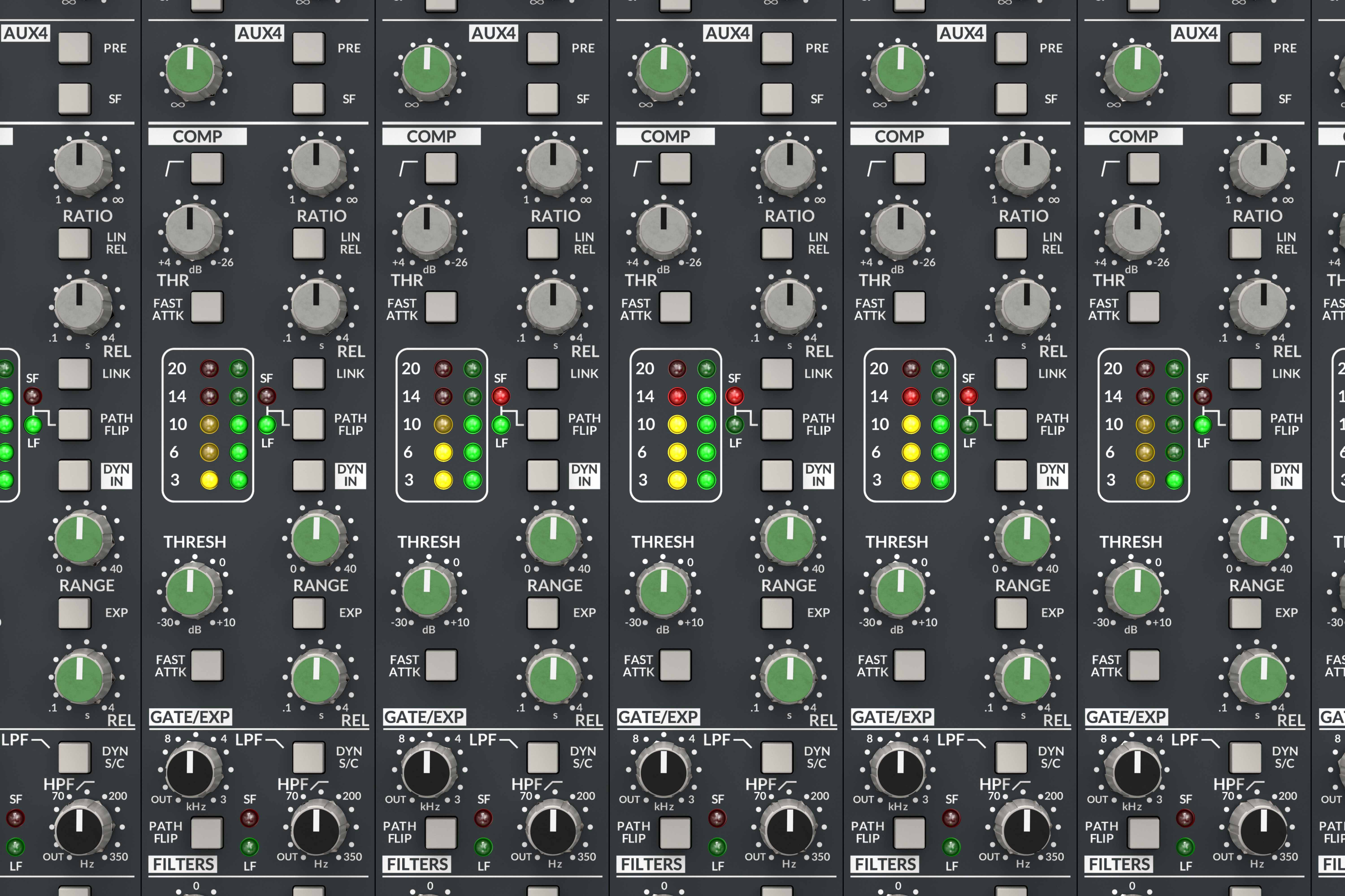 Jeder Kompressor verfügt über eine LINK-Funktion, die das Sidechain-Signal an die benachbarten Kanäle weiterleitet, sodass mehrere aufeinanderfolgende Kanäle miteinander verbunden werden können. Der Dynamikbereich des ORIGIN EVO verfügt über einen True-RMS-Sidechain-Detektor und eine vollständig diskrete Gain-Reduction-Stufe, identisch mit dem Class-A-VCA-Chip, der in der Originalkonsole verwendet wurde. Flexible Regler ermöglichen es Ihnen, die Soft-Knee-Kurve zu umgehen, einen schnellen Attack einzustellen und zwischen logarithmischem oder linearem Release zu wählen – und bieten so drei charakteristische Kompressionscharakteristiken, die unzählige klassische Aufnahmen geprägt haben.