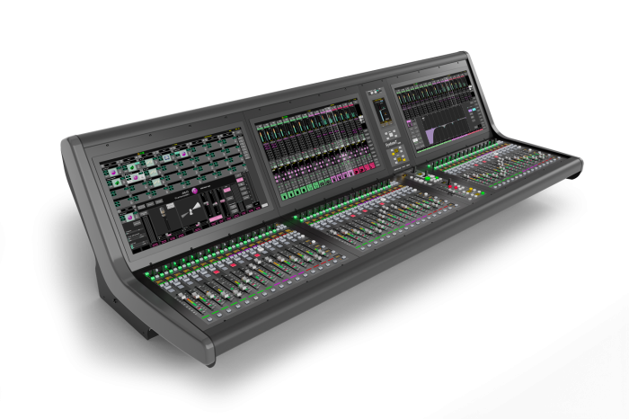 • 1–3 Multitouch-Bildschirme mit grafischer Benutzeroberfläche zur Steuerung aller Konsolenparameter und zur Konfiguration