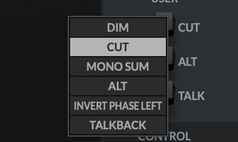 Die drei Schalter an der Vorderseite sind standardmäßig auf „CUT“ für die Monitore, die Umschaltung auf den ALT-Lautsprecher und das Ein- und Ausschalten des TALKBACK-Mikrofons voreingestellt. Sie können diese Tasten jedoch je nach Bedarf auf eine der folgenden Funktionen umlegen: DIM, CUT, MONO SUM, ALT, INVERT PHASE LEFT, TALKBACK.