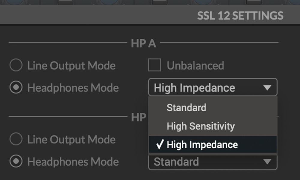 Wählen Sie für die Kopfhörerausgänge den Betriebsmodus, der am besten zu Ihren Kopfhörern passt – „Standard“, „Hohe Empfindlichkeit“ oder „Hohe Impedanz“. Alternativ können Sie jeden Kopfhörerausgang als symmetrischen/unsymmetrischen Monoausgang nutzen, falls Sie zusätzliche Line-Pegel-Ausgänge vom SSL 12 benötigen.