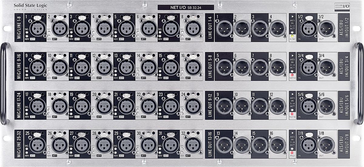 Der SB 32.24 ist ein robustes 5U-Gehäuse mit zwei redundanten Netzteilen, 32 Mikrofon-/Line-Eingängen, 16 analogen Line-Ausgängen sowie 8 digitalen Ein- und Ausgängen über 4 AES3-Ein-/Ausgangspaare. Er verfügt über zwei redundante RJ45-Dante-Netzwerkanschlüsse sowie einen vom Benutzer konfigurierbaren SFP-Anschluss, der mit RJ45- oder optischen Steckern bestückt werden kann. Diese können zur Netzwerkerweiterung oder zur Netzwerktrennung für den gainkompensierten Dante-„Split“ genutzt werden, um eine Verbindung zu einer zweiten Dante-fähigen Konsole oder einem entsprechend ausgestatteten Gerät in einem anderen Netzwerk herzustellen. Es verfügt über individuelle LEDs für Signalpräsenz, Übersteuerung und Phantomspeisung sowie eine Gesamtanzeige für Netzteil, Netzwerk A und B und den Hardware-Status.